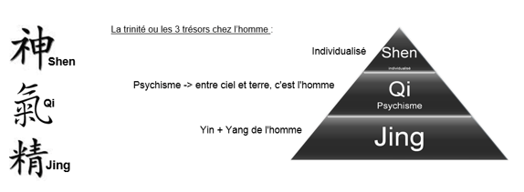 - le Jing : l’Essence vitale = l’inné : à la naissance (terrain, hérédité) ET l’acquis : lié à l’hygiène de vie, l’alimentation, les émotions.