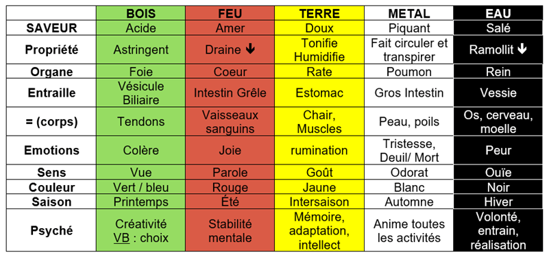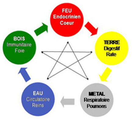La théorie des Cinq Eléments permet de classifier tout ce qui existe : la nature, les aliments, le corps humain, ses organes et ses tissus. Elle explique les relations que toutes ces structures entretiennent entre elles. Leurs interrelations proposent un modèle dynamique de lecture du monde matériel et immatériel.